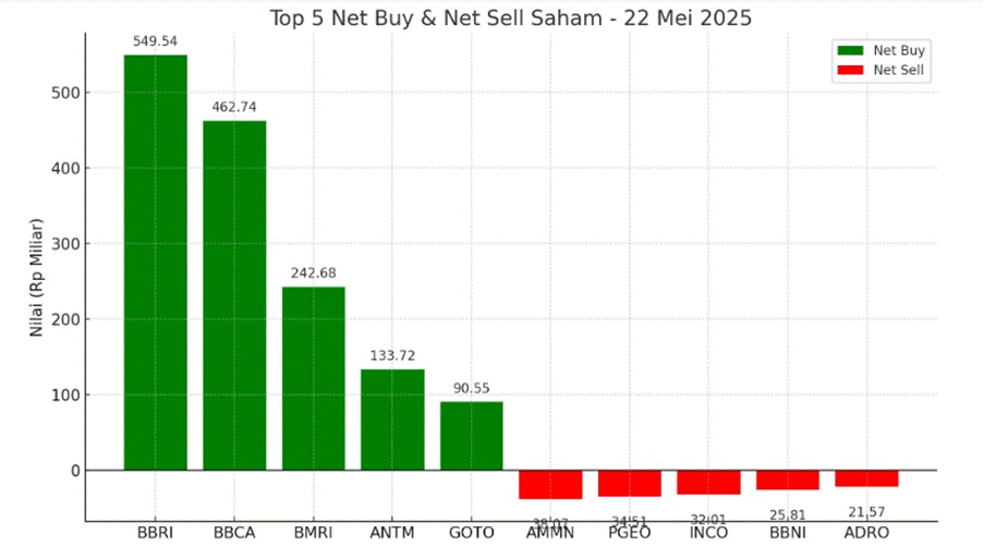 Net buy terbanyak kembali dimotori saham bank, seperti PT Bank Rakyat Indonesia Tbk (BBRI) Rp 549,54 miliar, PT Bank Central Asia Tbk (BBCA) Rp 462,74 miliar, PT Bank Mandiri Tbk (BMRI) Rp 242,68 miliar, PT Aneka Tambang Tbk (ANTM) Rp 133,72 miliar, dan PT GoTo Gojek Tokopedia Tbk (GOTO) Rp 90,55 miliar.