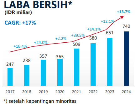 Tahun lalu, MTDL berhasil mencatatkan pendapatan ke level tertinggi sepanjang masa Rp25 triliun setelah terjadi kenaikan 13,9% dari tahun 2023. Laba bersih juga melesat 13,7% menjadi Rp 739,8 miliar.