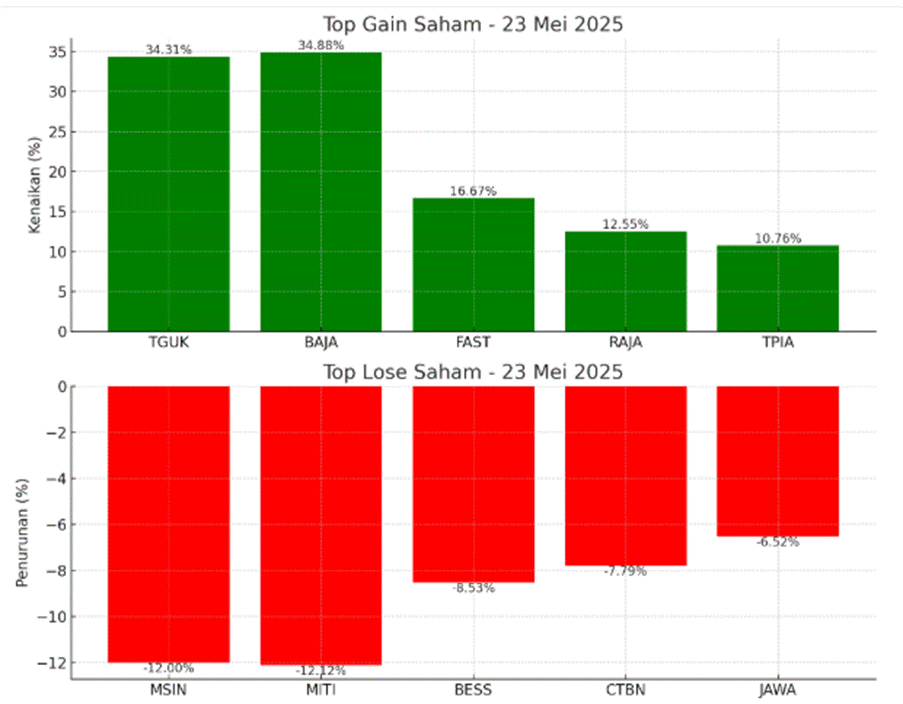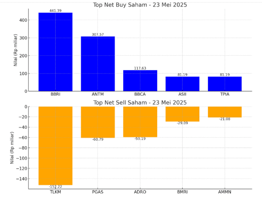 JAKARTA, investortrust.id – Investor asing membukukan pembelian bersih (net buy) saham senilai Rp 589,17 miliar, seiring dengan lompatan indeks harga saham gabungan (IHSG) Bursa Efek Indonesia (BEI), Jumat (23/5/2025), sebanyak 47,18 poin (0,66%) menjadi 7.214,16 dengan nilai transaksi Rp 11 triliun. Lompatan tersebut dimotori kenaikan pesat saham market cap besar PT Chandra Asri Paicific Tbk (TPIA).