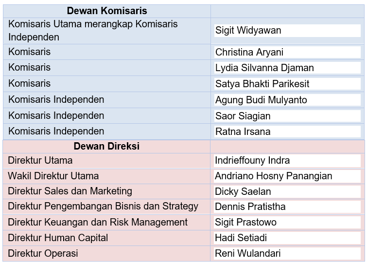 Komisaris Agung Budi Mulyanto sebagai Komisaris Independen; Bapak Indrieffouny Indra sebagai Direktur Utama; Bapak Dicky Saelan sebagai Direktur Sales dan Marketing; Bapak Dennis Pratistha sebagai Direktur Pengembangan Bisnis dan Strategy; Bapak Sigit Prastowo sebagai Direktur Keuangan dan Risk Management; dan Bapak Hadi Setiadi sebagai Direktur Human Capital.
