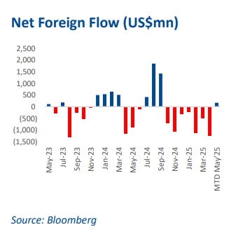 Meski IHSG telah melesat signifikan atau 22% terhitung sejak 8 April hingga 23 Mei 2025, BRI Danareksa Sekuritas masih memilih untuk mempertahankan target IHSG tahun ini sekitar 7.350. Target tersebut mengimplikasikan perkiraan PE sekitar 13,7 kali. “Kami juga masih melihat aliran dana asing ke pasar saham terus berlanjut, meski telah terjadi pembelian bernilai jumbo Mei berjalan,” tulisnya.