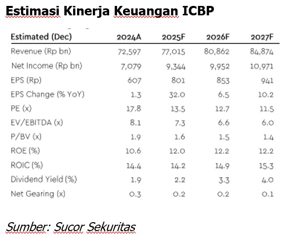 Analis Sucor Sekuritas Hansen Christian Seng mengatakan, peluang pertumbuhan kinerja keuangan ICBP diprediksi tetap atraktif tahun ini, meskipun margin keuntungan terkontraksi pada kuartal I-2025. “Kenaikan rata-rata harga jual sekitar 3% bersamaan dengan proyeksi kanaikan volume penjualan akan membuat kinerja bertumbuhan tahun ini,” tulisnya dalam riset yang diterbitkan di Jakarta, pekan ini.