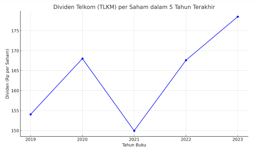 Berdasarkan data, Telkom (TLKM) salah satu BUMN dengan nialai dan rasio dividen besar. Telkom membagikan dividen tahun buku 2023 senilai Rp 178,50 per saham, tahun buku 2022 mencapai Rp 167,60 per saham, tahun buku 2021 mencapai Rp 149,97 per saham, tahun buku 2020 mencapai Rp 168,01 per saham, dan tahun buku 2019 sebanyak Rp 154,07 per saham.