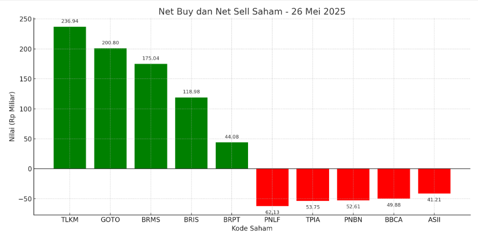 Net buy terbanyak melanda lima saham, yaitu PT Telkom Indonesia Tbk (TLKM) Rp 236,94 miliar, PT GoTo Gojek Tokopedia Tbk (GOTO) Rp 200,80 miliar, PT Bumi Resources Minerals Tbk (BRMS) Rp 175,04 miliar, dan PT Bank Syariah Indonesia Tbk (BRIS) Rp 118.98 miliar. Net buy juga melanda saham emiten Prajogo Pangestu, PT Barito Pacific Tbk (BRPT) Rp 44,08 miliar.