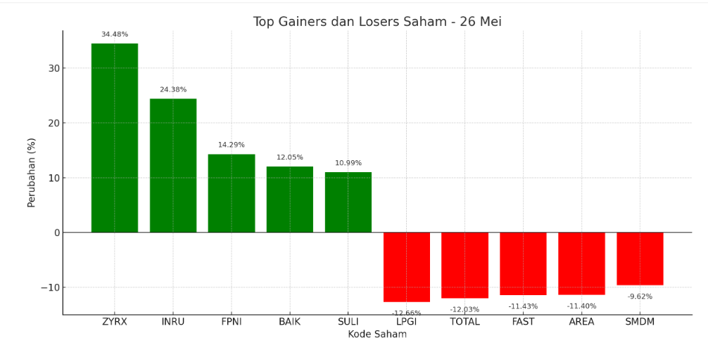 Kenaikan juga melanda saham PT Lotte Chemical Titan Tbk (FPNI) naik 14,29% menjadi Rp 224, PT Bersama Mencapai Puncak Tbk (BAIK) naik 12,05% menjadi Rp 93, dan PT SLJ Global Tbk (SULI) naik 10,99% menjadi Rp 101.