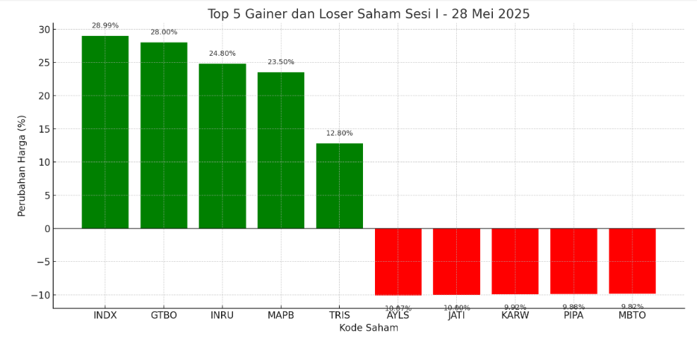 Sebaliknya lima saham dengan penurunan paling dalam, yaitu saham AYLS turun 10,07% menjadi Rp 125, JATI melemah 10% menjadi Rp 162, KARW turun 9,92% menjadi Rp 1.680, PIPA melemah 9,88% menjadi Rp 73, dan MBTO anjlok 9,82% menjadi Rp 101.