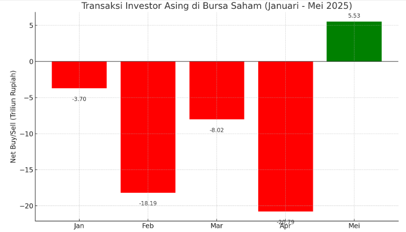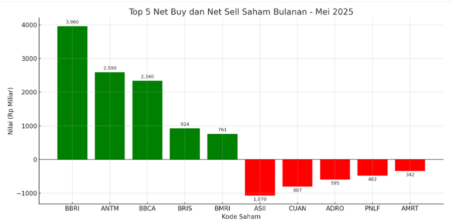 Sedangkan lima saham dengan net buy tebesar sepanajang Mei 2025 melanda saham PT Bank Rakyat Indonesia Tbk (BBRI) Rp 3,96 triliun, PT Aneka Tambang Tbk (ANTM) Rp 2,59 triliun, PT Bank Central Asia Tbk (BBCA) Rp 2,34 triliun, PT Bank Syariah Indonesia Tbk (BRIS) Rp 923,51 miliar, dan PT Bank Mandiri Tbk (BMRI) Rp 760,80 miliar.