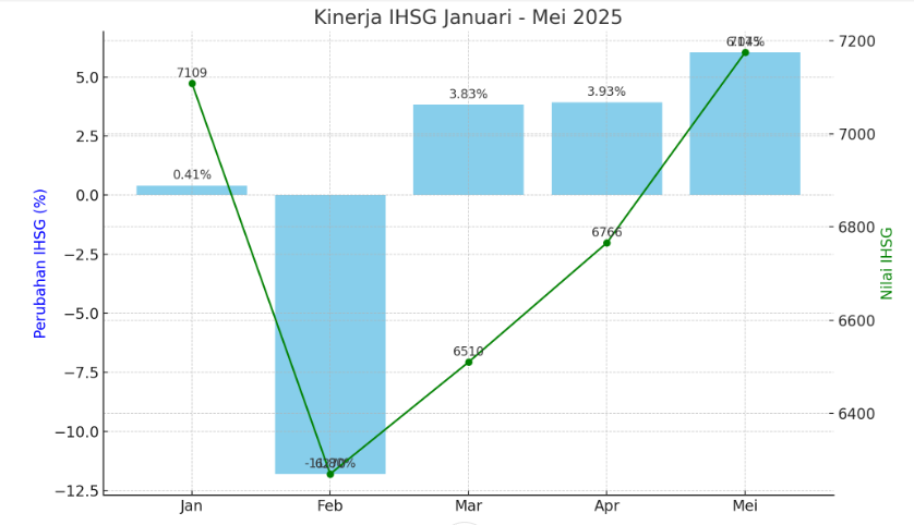 Terkait IHSG bulan Mei 2025, BEI mencatatkan kenaikan sebanyak 6,04% dari 6.766 menjadi 7.175. Penguatan ini tercatat rekor tertinggi bulanan indeks tahun ini. Penguatan IHSG sepanjang Mei tertinggi dibandingkan dengan bulan Januari 2025 hanya naik tipis 0,41% dari 7.079 menjadi 7.109, Ferbuari dengan penurunan dahsyat sebanyak 11,80% dari 7.109 menjadi 6.270, Maret 2025 kembali rebound 3,83% dari 6.270 menjadi 6.510, dan April 2025 terjadi penguatan 3,93% dari 6.510 menjadi 6.766.