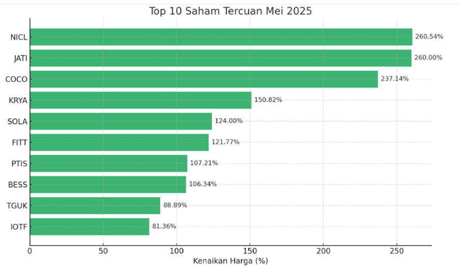 Berdasarkan data, saham tercuan dengan kenaikan tertinggi sepanjang bulan Mei 2025 terdiri atas saham PT PAM Mineral Tbk (NICL) melesat 260,54% menjadi Rp 1.405, PT Informasi Tenologi Indonesia Tbk (JATI) naik 260% menjadi Rp 162, PT Wahana Interfood Nusanatara Tbk (COCO) naik sebanyak 237,14% menjadi Rp 236.