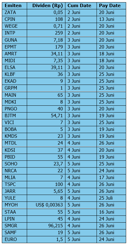 Emiten dengan nilai dividen besar lainnya yang akan cum dividen periode 2-6 Juni adalah PT Tempo Scan Paicifc Tbk (TSPC) bernilai Rp 100 per saham dan PT Semen Indonesia Tbk (SMGR) dengan nilai dividen Rp 96,22 per saham.