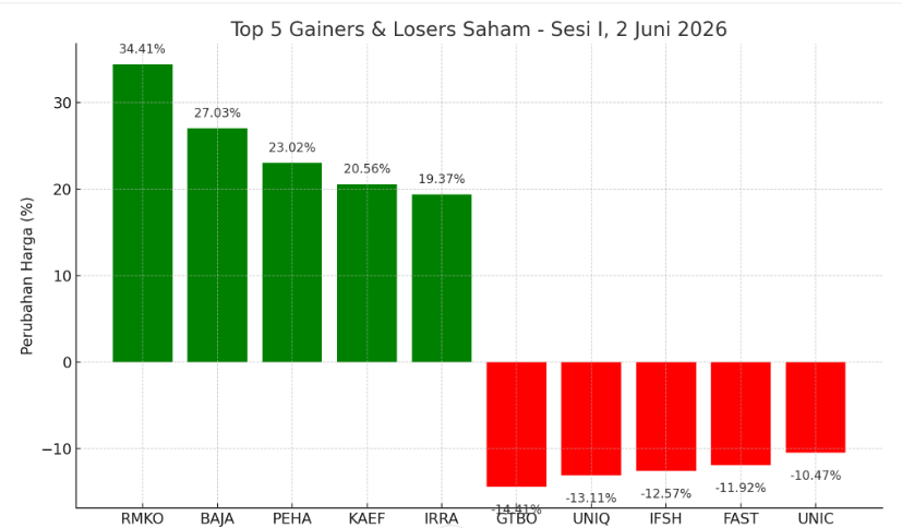 Meskipun indeks turun sejumlah saham berikut cetak penguatan pesat, yaitu PT Royaltama Mulia Kontraktorindo Tbk (RMKO) naik 34,41% menjadi Rp 125 dan PT Saranacentral Bajatama Tbk (BAJA) naik 27,03% menjadi Rp 141. Lompatan harga juga melanda saham farmasi ini, yaitu PT Phapros Tbk (PEHA) naik 23,02% menjadi Rp 342, PT Kimia Farma Tbk (KAEF) naik 20,56% menjadi Rp 645, dan PT Itama Ranoraya Tbk (IRRA) menguat 19,37% menjadi Rp 530.