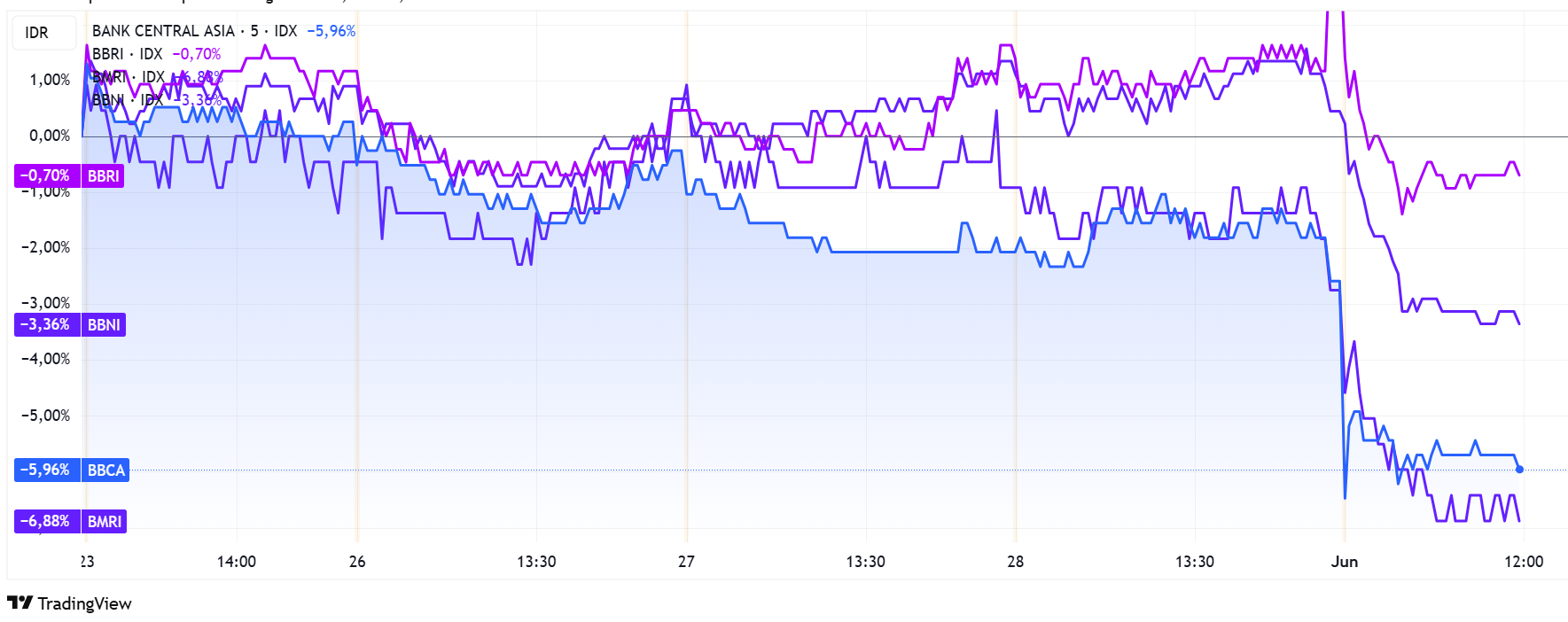 Berdasarkan data BEI, saham PT Bank Central Asia Tbk (BBCA) melemah 3,46% menjadi Rp 9.075, saham PT Bank Rakyat Indonesia Tbk (BBRI) melemah sebanyak 4,04% menjadi Rp 4.270, saham PT Bank Mandiri Tbk (BMRI) turun sebanyak 4,25% menjadi Rp 5.075, dan PT Bank Negara Indonesia Tbk (BBNI) melemah sebanyak 3,79% menjadi Rp 4.320.