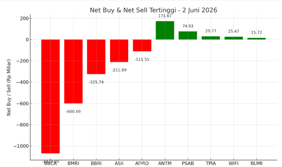 Net sell terbanyak melanda tiga saham bank berikut, yaitu PT Bank Central Asia Tbk (BBCA) Rp 1,07 triliun, PT Bank Mandiri Tbk (BMRI) Rp 600,69 miliar, PT Bank Rakyat Indonesia Tbk (BBRI) Rp 325,74 miliar. Net sell juga melanda saham PT Astra International Tbk (ASII) Rp 211,99 miliar dan PT Alamtri Resources Indonesia Tbk (ADRO) Rp 111,55 miliar.