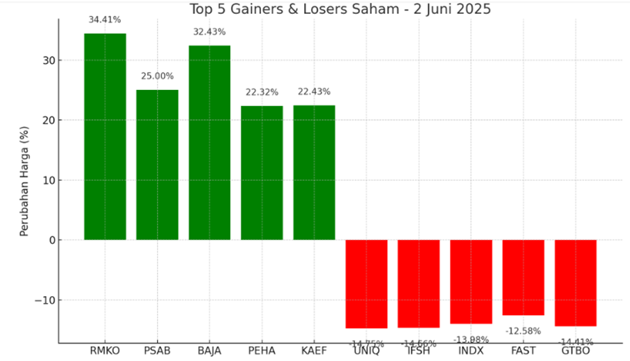 Sebaliknya saham dengan penurunan paling dalam, yaitu UNIQ anjlok 14,75% menjadi Rp 416, IFSH melemah 14,66% menjadi Rp 815, INDX turun 13,98% menjadi Rp 80, saham FAST turun 12,58% menjadi Rp 264, dan GTBO sebanyak 14,41% menjadi Rp 202.