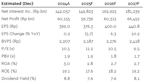 Terkait kinerja keuangan tahun ini, Sucor Sekuritas memperkirakan penurunan laba bersih BBRI menjadi Rp 56,73 triliun, dibandingkan tahun 2024 sebanyak Rp 60,15 triliun. Sebaliknya pendapatna Bungan bersih diperkirakan naik dari Rp 142,05 triliun menjadi Rp 149,82 triliun.