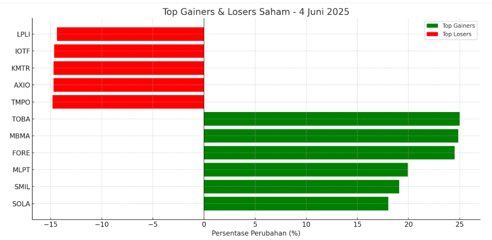 Di tengah penguatan tersebut, empat saham ini catatkan kenaikan hingga auto reject atas (ARA), yaitu saham PT TBS Energi Utama TBk (TOBA) naik 25% menjadi Rp 565, PT Fore Indonesia Tbk (FORE) menguat 24,51% menjadi Rp 635, PT Merdeka Battery Materials Tbk (MBMA) naik 24,86% menjadi Rp 452, dan PT Multipola Technology Tbk (MLPT) naik 19,93% menjadi Rp 25.275.