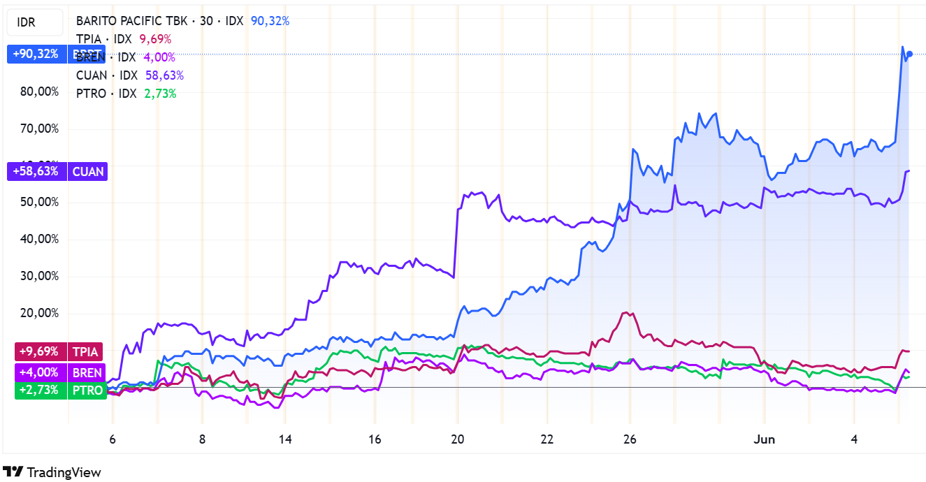 Data BEI hingga pukul 10.30 WIB, kenaikan tertinggi dicatatkan saham PT Barito Pacifik Tbk (BRPT) sebanyak 14,34% menjadi Rp 1.480. Kemudian, saham PT Petrindo Jaya Kreasi Tbk (CUAN) melesat sebanyak 6,07% menjadi Rp 12.225, saham PT Barito Renewables Energy Tbk (BREN) melesat 6,10% menjadi Rp 6.525, PT Chandra Asri Pacific Tbk (TPIA) naik 4,07% menjadi Rp 9.600, dan PT Petrosea Tbk (PTRO) naik 3,79% menjadi Rp 3.010.