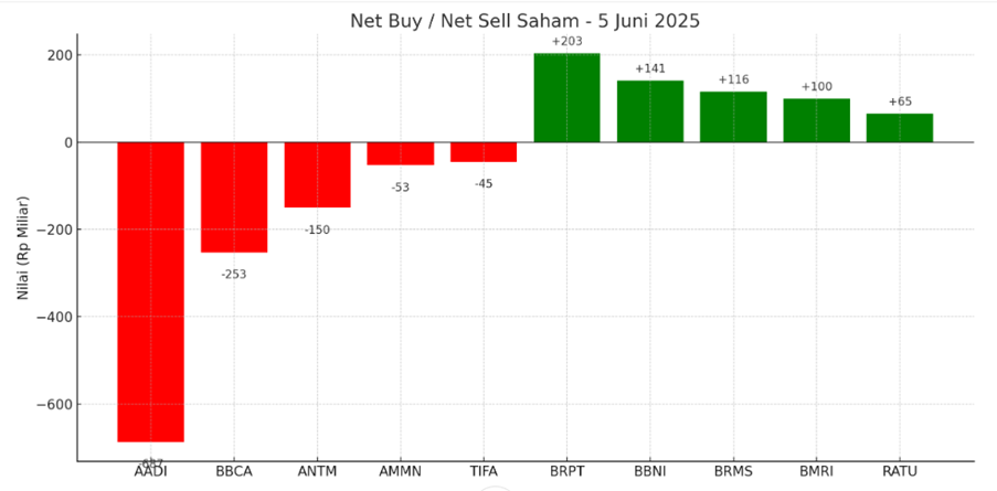 Net sell terbanyak melanda saham PT Adaro Andalan Indonesia Tbk (AADI) Rp 686,56 miliar, PT Bank Central Asia Tbk (BBCA) Rp 252,66 miliar, PT Aneka Tambang Tbk (ANTM) Rp 150,10 miliar, PT Amman Mineral Internasional Tbk (AMMN) Rp 52,92 miliar, dan PT KDB Tifa Finance Tbk (TIFA) Rp 44,76 miliar.