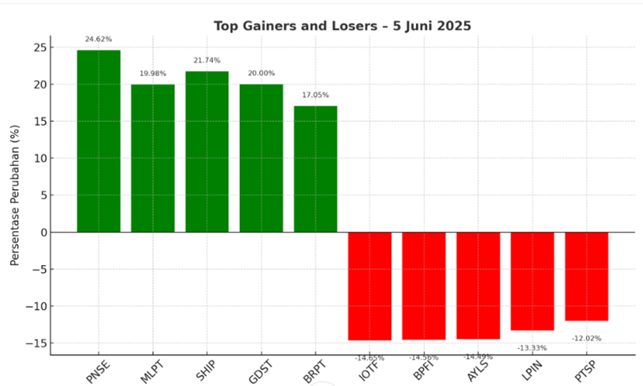 Di tengah penguatan indeks perdagangan terakhir pekan ini, saham ditutup melesat hingga auto reject atas (ARA), yaitu PT Pudjiadi & Sons Tbk (PNSE) menguat 24,62% menjadi Rp 486 dan PT Multipolar Technology Tbk (MLPT) naik 19,98% menjadi Rp 30.325.