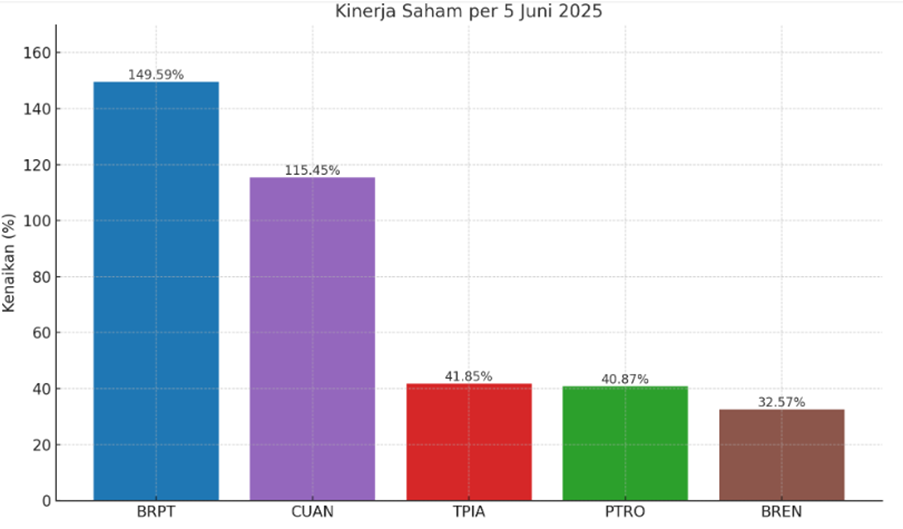 Penguatan pesat juga melanda saham TPIA, PTRO, dan BREN. Saham TPIA berhasil catatkan kenaikan sebanyak 41,85% menjadi Rp 9.575, saham PTRO menguat sebanyak 40,87% menjadi Rp 2.930, dan BREN menguat sebanyak 32,57% menjadi Rp 6.350.