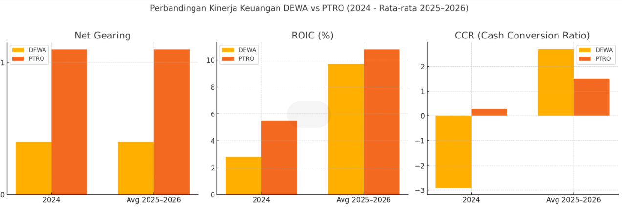 Selain itu, Sucor Sekuritas menyebutkan, DEWA menunjukkan peluang perbaikan tajam profitabilitas (ROIC) dan arus kas (CCR) ke depan, dibandingkan PTRO. DEWA memiliki tingkat kemampuan tinggi untuk mengubah laba menjadi kas secara efisien ke depan terlihat dari perkiraan rata-rata CCR meningkat menjadi 2,7 kali pada 2025-2026, dibandingkan perkiraan PTRO sebanyak 1,5 kali.