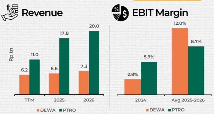 Sucor Sekuritas menyebutkan bahwa DEWA menunjukkan potensi perbaikan pesat kinerja keuangan ke depan, terutama dari sisi margin dan valuasi pasar, meskipun pendapatan masih jauh di bawah PTRO. Dengan valuasi P/E dan P/BV yang lebih rendah, DEWA siap mengejar ketertinggalan dari PTRO, jika perseroan mampu untuk merealisasikan target kinerja keuangan sesuai ekspektasi.