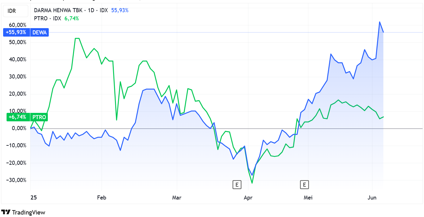Dengan perbaikan tersebut terbuka peluang peningkatan pesat kapitalisasi pasar (market cap) DEWA menuju level Rp 6,6 triliun, dibandingkan posisi tahun lalu baru mencapai Rp 2,4 triliun. Sedangkan PTRO lanjutkan peningkatan menjadi Rp 28 triliun atau tren peningkatan cenderung melambat.