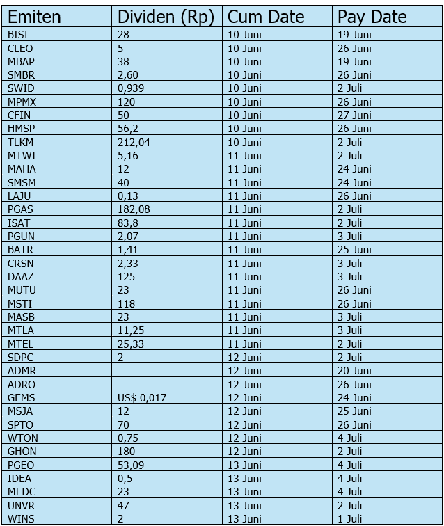 Berdasarkan data Telkom (TLKM) menetapkan dividen senilai Rp 212,04 per saham. Dengan harga penutupan saham TLKM akhir pekan lalu Rp 2.840, imbal hasil (yield) dividen mencapai 7,46%. Emiten telekomunikasi terbesar di Indonesia ini akan menggelar cum dividen pada 10 Juni dan pembayaran dividen pada 2 Juli.