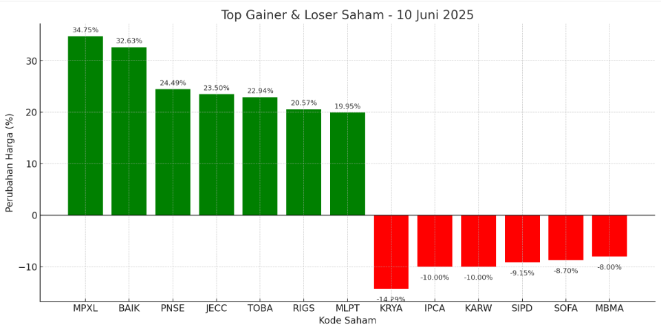 Terkait penguatan indeks hari ini ditopang lompatan harga saham emiten Prajogo Pangestu, seperti TPIA naik 9,92% menjadi Rp 10.525, BREN menguat 5,91% menjadi Rp 6.725, CUAN naik 8,44% menjadi Rp 12.850.