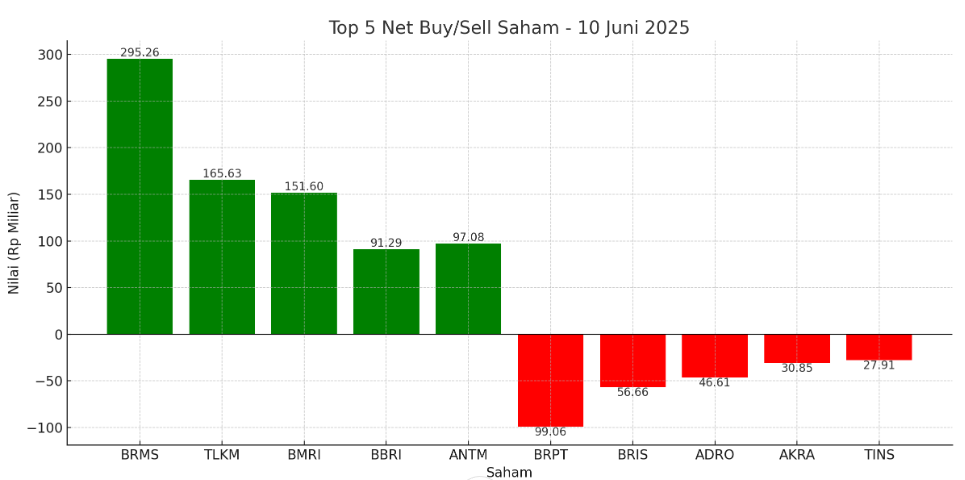 Sebaliknya lima saham dengan penjualan bersih (net sell) terbanyak melanda saham, PT Barito Pacific Tbk (BRPT) Rp 99,06 miliar, PT Bank Syariah Indonesia Tbk (BRIS) Rp 56,66 miliar, PT Alamtri Resources Indonesia Tbk (ADRO) Rp 46,61 miliar, PT AKR Corporindo Tbk (AKRA) Rp 30,85 miliar, dan PT Timah Tbk (TINS) Rp 27,91 miliar.