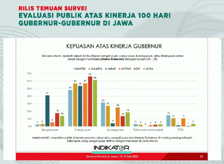 JAKARTA, Investortrust.id -- Indikator Politik Indonesia merilis hasil survei terhadap kinerja 100 hari gubernur-gubernur di Pulau Jawa, Rabu (28/5/2025). Berdasarkan survei yang dilakukan Indikator di 6 provinsi di Indonesia, Gubernur Jawa Barat Dedi Mulyadi memperoleh tingkat kepuasan paling tinggi.